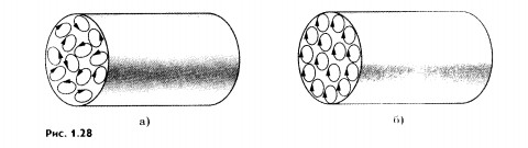 Согласно гипотезе Ампера внутри молекул и атомов циркулируют элементарные электрические токи. (Теперь мы хорошо знаем, что эти токи образуются вследствие движения электронов в атомах.) Если плоскости, в которых циркулируют эти токи, расположены беспорядочно по отношению друг к другу из-за теплового движения молекул (рис. 1.28, а), то их действия взаимно компенсируются, и никаких магнитных свойств тело не обнаруживает. В намагниченном состоянии элементарные токи в теле ориентированы так, что их действия складываются (рис. 1.28, б). Гипотеза Ампера объясняет, почему магнитная стрелка и рамка (контур) с током в магнитном поле ведут себя одинаково (см. § 2). Стрелку можно рассматривать как совокупность маленьких контуров с током, ориентированных одинаково. Наиболее сильные магнитные поля создают вещества, называемые ферромагнетиками. Магнитные поля создаются ферромагнетиками не только вследствие обращения электронов вокруг ядер, но и вследствие их собственного вращения.