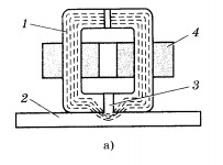Магнитная лента представляет собой гибкую основу из полихлорвинила или других веществ. На нее наносится рабочий слой в виде магнитного лака, состоящего из очень мелких игольчатых частиц железа или другого ферромагнетика и связующих веществ. Запись звука производят на ленту с помощью электромагнита, магнитное поле которого изменяется в такт со звуковыми колебаниями. При движении ленты вблизи магнитной головки различные участки пленки намагничиваются. Схема магнитной индукционной головки показана на рисунке 1.29, а, где 1 — сердечник электромагнита; 2 — магнитная лента; 3 — рабочий зазор; 4 — обмотка электромагнита.