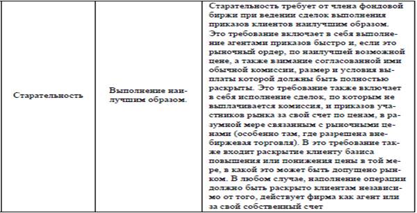 Старательность требует от члена фондовой биржи при ведении сделок выполнения приказов клиентов наилучшим образом. Это требование включает в себя выполнение агентами приказов быстро и, если это рыночный ордер, по наилучшей возможной цене, а также взимание согласованной ими обычной комиссии, размер и условия выплаты которой должны быть полностью раскрыты. Это требование также включает в себя исполнение сделок, по которым не выплачивается комиссия, и приказов участников рынка за свой счет по ценам, в разумной мере связанным с рыночными ценами (особенно там, где разрешена внебиржевая торговля). В это требование также входит раскрытие клиенту базиса повышения или понижения цены в той мере, в какой это может быть допущено рынком. В любом случае, наполнение операции должно быть раскрыто клиентам независимо от того, действует фирма как агент или за свой собственный счет.