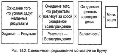 Основной вклад в развитие процессуальных теорий внес В. Врум. В основе его работы лежит теория ожиданий, суть которой схематично отражена на рис. 14.2. Эта теория основана на предположении, что человек направляет свои усилия на достижение какой-либо цели только тогда, когда уверен в большой вероятности удовлетворения своих потребностей.