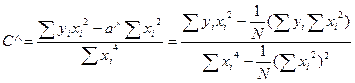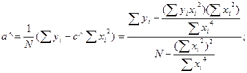 При сплайн интерполяции ось Х разбивается на участки и проводится кусочная интерполяция. Так же можно поступать и при апроксимации, имея на каждом участке свой эталон, например, полином а+бХ+сХ2+... и оптимальным образом находить а,б,с, считая их оценками а^ б^ с^. Для нахождения оценок используем критерий минимума квадрата отклонения. В таблице 3 приведены формулы оценок а^,b^,c^.
