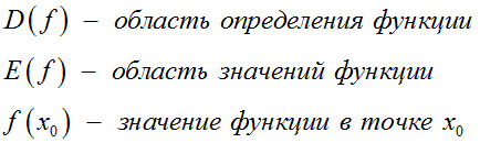 D(f) - значения аргумента. E(f) - значения функции. Если функция задана формулой, то считают, что область определения состоит из всех значений переменной, при которых эта формула имеет смысл.