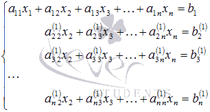 К такому же результату мы бы пришли, если бы выразили x1 через другие неизвестные переменные в первом уравнении системы и полученное выражение подставили во все остальные уравнения. Таким образом, переменная x1 исключена из всех уравнений, начиная со второго.
