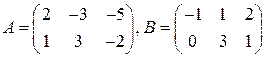 Решение: Для того, чтобы найти матицу АТ, надо в матрице А заменить строки на столбцы и наоборот. Значит, в матрице АТ будет 3 строки и 2 столбца, т.е. АТ – матрица размера 3´2. При этом первая строка матрицы А станет первым столбцом матрицы АТ, вторая строка станет вторым столбцом: