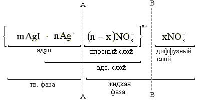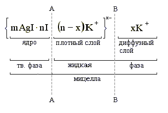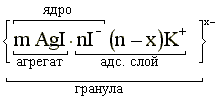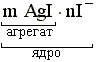 При сливании растворов в присутствии стабилизатора возникают незаметные на глаз микрокристаллики иодида серебра, каждый из которых является агрегатом, состоящим из некоторого числа m молекул AgI. Агрегат в результате избирательной адсорбции ионов I- (согласно правилу Панета-Фаянса) приобретает заряд. Ионы I-, адсорбируясь в некотором количестве n, сообщают ему отрицательный заряд. Ионы, определяющие заряд агрегата называют потенциалопределяющими. Агрегат и потенциалопределяющие ионы образуют ядро мицеллы, ее твердую фазу. Это записывают так: