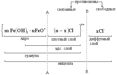 Таким образом, твердую фазу составляют агрегат и потенциалопределяющие ионы, а все противоионы (связанные и свободные) – находятся в жидкой фазе. Граница между твердой фазой и жидкой фазой называется межфазной границей (АА). Граница между гранулой и диффузным слоем называется границей скольжения (ВВ); по этой условной границе происходит перемещение в электрическом поле гранулы (дисперсной фазы) и противоионов диффузного слоя (дисперсионной среды) к противоположно заряженным электродам.