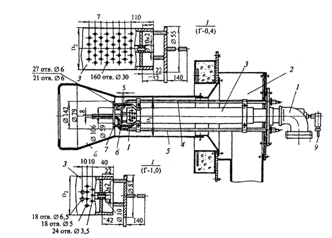 2.2. Горелки Г-0,4 и Г-1,0. Газовая горелка конструкции ЦКТИ и завода «Ильмарине» предназначена для использования в топках котлов, работающих с наддувом 200-500 Па или с разрежением 20-30 Па. Горелка