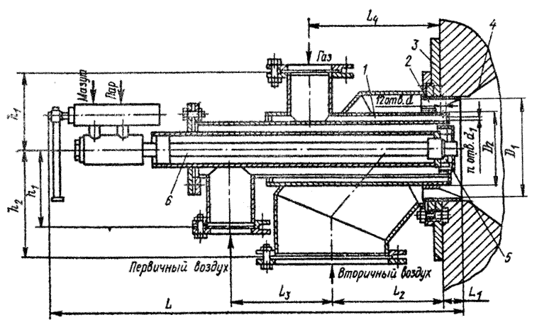Рис. 5. Горелка газомазутная ГМГм: 1 – газовоздушная часть; 2, 5 – лопаточные завихрители вторичного и первичного воздуха; 3 – монтажная плита; 4 – керамический туннель; 6 – паромеханическая форсунка.