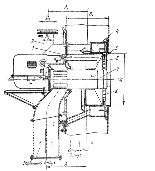 Рис. 6. Горелка РГМГ – 10, 20, 30. 1 – ЗЗУ; 2 – газоподводящий патрубок; 3 – короб первичного воздуха; 4- газовый коллектор; 5 – лопаточный аппарат; 6 – газовыпускные отверстия; 7 – ротационная форсунка.