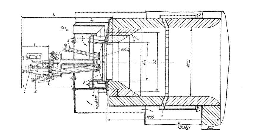 коленообразной подводящей трубы. Внутри коллектора приварена разделительная обечайка для равномерного распределения газа по его объему. К торцу коллектора присоединен кольцевой обод полукруглой формы для обеспечения плавного входа воздуха в воздухонаправляющее устройство (ВНУ), основными элементами которого являются лопаточный завихритель и фурма (амбразура). Неподвижные профильные лопатки