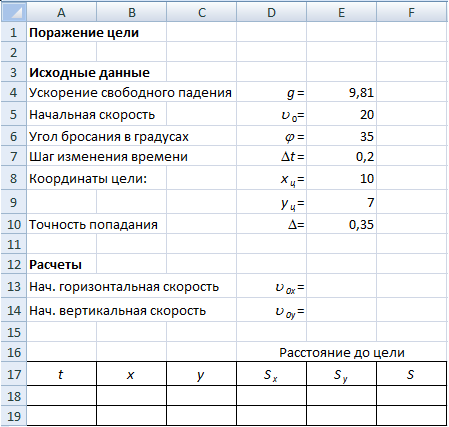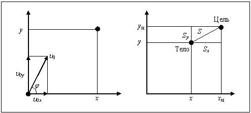 | Расстояние между телом и целью: - по горизонтали Sx; - по вертикали Sy; - полное S | Результаты Результаты Результаты |