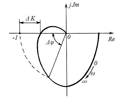 Запас устойчивости по фазе равен величине угла Δφ, на которую должно измениться запаздывание по фазе, чтобы система оказалась на границе устойчивости.