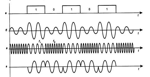При аналоговой передаче информация кодируется изменением амплитуды, частоты или фазы синусоидального сигнала несущей частоты. Основные способы аналоговой модуляции (кодирования сигнала) показаны на рис. 8. На диаграмме (рис. 8, а) показана последовательность бит исходной информации, представленная потенциалами высокого уровня для логической единицы и потенциалом нулевого уровня для логического нуля.
