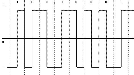 Цифровые сигналы применяются в сетевых технологиях более часто. Все стандартные медные и оптоволоконные среды передачи данных используют различные формы цифровых сигналов. Способ кодирования сигнала определяется конкретным протоколом Канального уровня. Все сети Ethernet, например, используют манчестерскую систему кодирования, как для витой пары, так и для коаксиального и оптоволоконного кабеля. В большинстве случаев сигнал формируется в результат перехода между положительным и отрицательным напряжением, хотя иногда также используется нулевое напряжение. Действительное значение напряжения не имеет значения; важен переход, формирующий сигнал. Передаваемый сигнал разбивается в соответствии с отрезками времени, называемыми ячейками (cells), и напряжение для каждой ячейки представляется двоичной величиной. Положительное значение - ноль, отрицательное - единица. Такой метод кодирования сигнала кажется простым и логичным путем преобразования двоичной информации, но имеет один существенный изъян - необходимость синхронизации. Когда двоичный код состоит из двух или более следующих друг за другом единиц или нулей, то на протяжении двух или более ячеек не происходит изменение напряжения. Если две системы, обменивающиеся информацией, не имеют таймеров, синхронизированных с большой точностью, то невозможно правильно определить количество переданных двоичных посылок. Некоторые системы могут использовать такой способ кодирования в силу того, что они имеют внешний синхронизирующий сигнал, который обеспечивает синхронизацию взаимодействующих систем. Однако большинство информационных сетей задействует узкополосную среду передачи, которая разрешает единовременную пересылку только одного сигнала. Поэтому такие сети используют другой способ кодирования, который обладает свойством самосинхронизации (self-timing).
