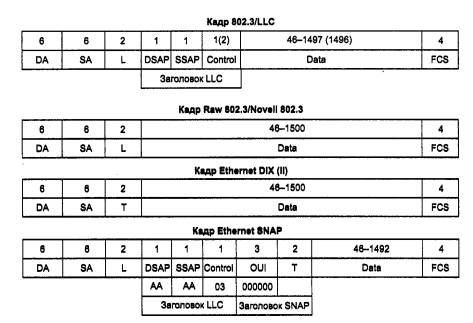 · кадр 802.3/LLC (кадр 802.3/802.2 или кадр Novell 802.2);