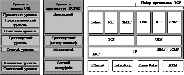 Протоколы TCP/IP соответствуют четырехуровневой концептуальной модели, известной как модель DARPA. Уровни в этой модели называются так: прикладной, транспортный, межсетевой и сетевой интерфейс. Каждый уровень в модели DARPA соответствует одному или более уровням в семиуровневой модели OSI (Open Systems Interconnection). Архитектура протоколов TCP/IP показана на рис. 24.