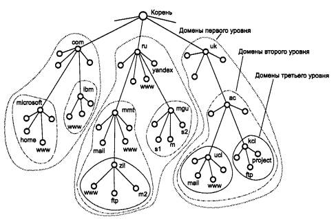 Для эффективной организации именования компьютеров в больших сетях естественным является применение иерархических составных имен. В стеке TCP/IP применяется доменная система имен, которая имеет иерархическую древовидную структуру, допускающую использование в имени произвольного количества составных частей (рис. 25).