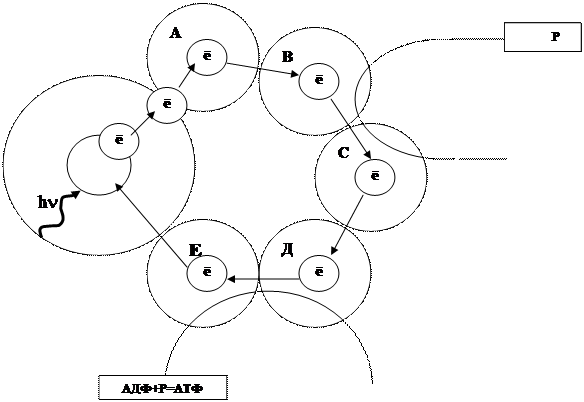 Квант света (рис.1), попадая в молекулу хлорофилла, поглощается. Под влиянием поглощенного света хлорофилл приходит в триплетное (возбужденное) состояние. Поглощенная энергия переводит электроны в сложной молекуле хлорофилла с основного энергетического уровня на более высокий. Богатые энергией электроны не возвращаются в свое нормальное состояние. Вместо этого они отрываются от молекулы хлорофилла и переносятся специфическими молекулами-переносчиками электронов (А, В, С, Д, Е), которые передают электроны друг другу по замкнутой цепи. Проделывая путь вне молекулы хлорофилла, возбужденные электроны передают поглощенную энергию от одного переносчика другому и возвращаются на свой основной уровень в молекуле хлорофилла. После этой процедуры молекула хлорофилла оказывается вновь готовой к поглощению второго кванта света.
