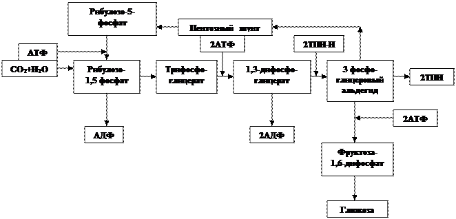 Главным промежуточным продуктом в сложном цикле реакций служит рибулозодифосфат (РДФ), который присоединяет к себе углекислый газ и образуется две молекулы 3-фосфоглицерата. Фосфоглицерат восстанавливается при участии ТПН-Н и в результате ряда реакций превращается в глюкозу. В результате ряда реакций – пентозный шунт – вновь образуется РДФ (рис.3).