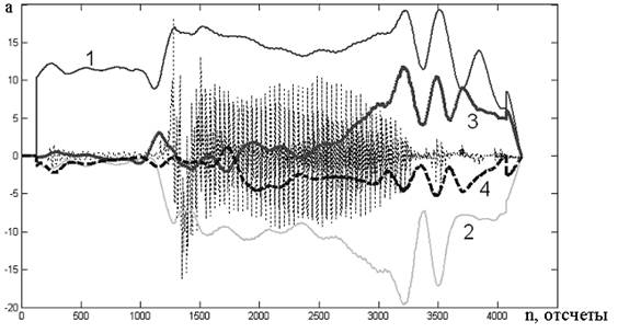 Рисунок 3.8 - Динамическое распределение коэффициентов линейного предсказания, где 1 – первый коэффициент линейного предсказания, 2 – второй коэффициент линейного предсказания, 3 – третий коэффициент линейного предсказания, 4 - четвертый коэффициент линейного предсказания