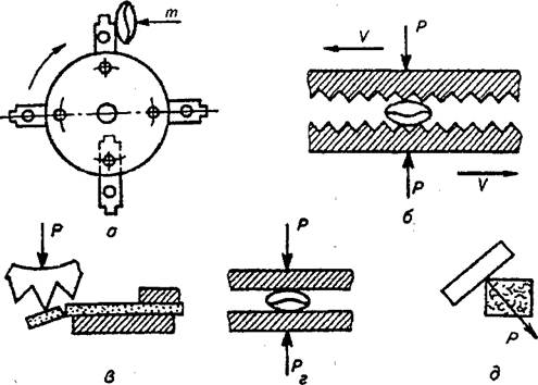 а - дробление ударом; б - истирание или размол; в - раскалывание; г - плющение; д - резание; т - масса измельчаемого корма; v - скорость передвижения измельчающих поверхностей; Р – разрушающая сила.