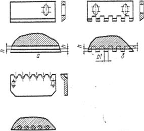Гребенчатый нож (рисунок 2) отрезает стружку в виде узких полосок шириной b 1,равной ширине гребня, толщиной h, равной высоте установки, и длиной l, равной длине частиц продукта. Такая стружка соответствует требованиям кормления молодняка крупного рогатого скота и свиней. Гребенчатые ножи закрепляют на диске или барабане со смещением по длине один относительно другого на величину, равную ширине b 1 гребня. При такой установке гребни первого ножа снимают стружку шириной b 1 и толщиной h, а гребни второго ножа срезают остающиеся выступы.