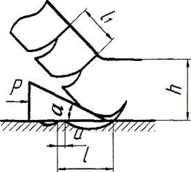 В первый момент, в соответствии с теорией В. П. Горячкина, нож (клин) с углом заточки α (рисунок 3), внедряясь в материал, под действием силы P сжимает стружку на пути α.