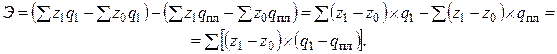 Разность между числителем и знаменателем индекса представляет собой фактическую экономию (перерасход), полученный в результате изменения себестоимости в отчетном периоде по сравнению с базисным периодом.