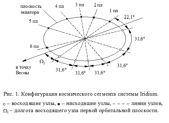 Орбитальная группировка (ОГ) системы Iridium [Э] состоит из 66-ти основных ИСЗ, выведенных на высоту 780 км над поверхностью Земли, и 6-ти резервных с высотой орбиты около 645 км. Основные спутники распределены в 6-ти равноудаленных друг от друга орбитальных плоскостях по 11 ИСЗ в каждой плоскости. Угловой разнос между ИСЗ в одной плоскости составляет примерно 32,7°. Соседние орбитальные плоскости разнесены по долготе восходящего узла примерно на 31,6°, а разнос между 6-ой и 1-ой плоскостями составляет 22,1° (рис. 1). Фазовый сдвиг между ИСЗ в соседних орбитальных плоскостях составляет 16,35° [К]. Вид орбиты – квазиполярная круговая с наклонением 86,4°. Период обращения ИСЗ при высоте 780 км составляет 100 мин. 28 сек.
