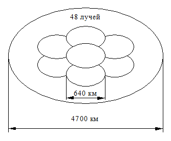 Каждый ИСЗ орбитальной группировки формирует 48 парциальных лучей, образуя каждым лучом на поверхности Земли соту диаметром 640 км. В совокупности 48 лучей создают на поверхности Земли комбинированную зону обслуживания (рис. 2), образованную одинаковыми по размеру сотами, сконцентрированными вокруг центральной соты.