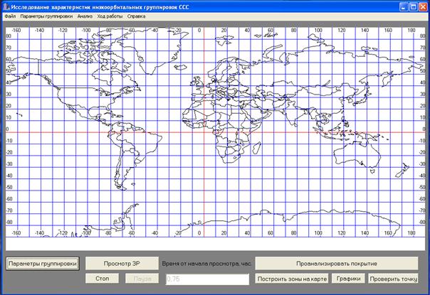 Кнопка ”Проанализировать покрытие” запускает программу анализа зон обслуживания каждого спутника группировки. Результатом работы программы является получение информации для последующего построения карты обслуживания и графиков распределения кратности обслуживания по широтам. Работы программы завершается запросом “Продолжить?”.