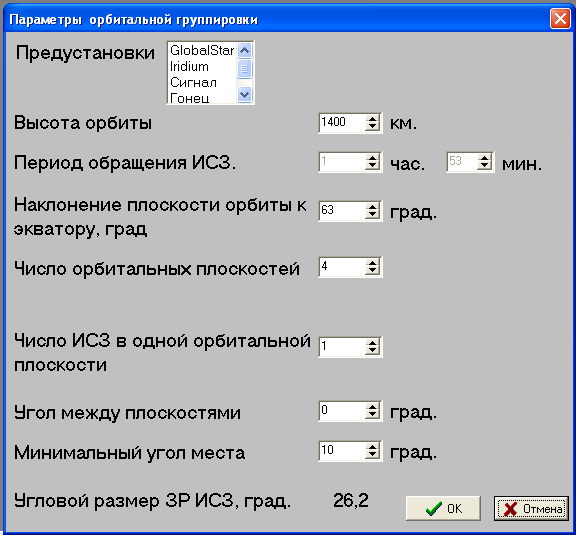 Кнопка “Параметры группировки” вызывает окно ввода исходных параметров орбитальной группировки (рис. 5). Параметры могут задаваться произвольными в полях ввода, либо для конкретной группировки – Iridium, Globalstar – выбором в поле “Предустановки”.