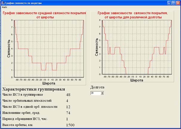 Кнопка “Графики” вызывает окно просмотра графиков (рис. 6) зависимости связности покрытия от широты и долготы. Становится доступной для вызова только после выполнения функции анализа зон обслуживания.