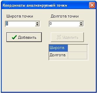 Кнопка “Проверить точку” вызывает окно отметки точки на карте (рис. 7). Возможность отметки на карте точки с заданными координатами облегчает исследование кратности обслуживания конкретной точки в различные моменты времени.