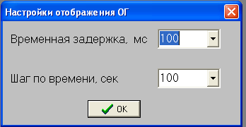 В этом окне задается шаг по времени, который используется при расчете очередного положения подспутниковой точки при отображении ОГ и временная задержка, подбираемая исходя из быстродействия компьютера.