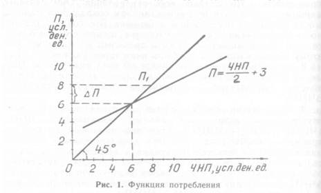1. График функции потребления представлен на рис. 1. Точка равновесия установится на пересечении графика П и «45°-ной прямой», при П = 6 усл. ден. ед. В этой точке потребительские расходы П будут равны доходам продавцов потребительских товаров и услуг, включаемым в ЧНП.