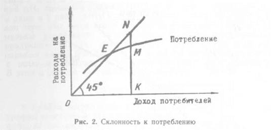 Соотношение между склонностью к сбережению и склонностью к потреблению в «Экономикс» рассматривается как весьма важная пропорция. При малом доходе потребление может быть выше самого дохода и покрываться за счет долгов прошлых сбережений и т. п. В любом случае сумма потребления и сбережений равна доходу (рис. 2).