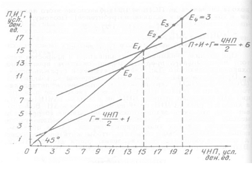 В этом случае окончательная точка равновесия Е4 совпадает с точкой полной занятости 3 (см. рис. 4).