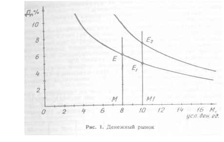 3.Центральный банк выпускает дополнительные денежные средства на сумму 2 усл. ден. ед. Ml = 10 усл. ден. еж Так как спрос на деньги не изменился, а предложение их возросло, то процент снижается. Происходит движение вдоль кривой спроса до точки Е1, соответствующей M l. Ставка процента в этом случае окажется равной 5%.