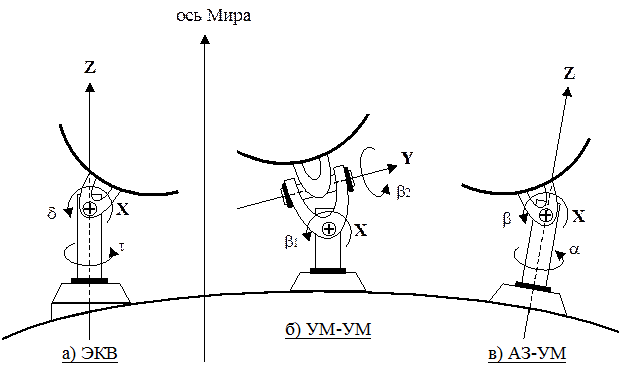 Направление на ИСЗ в пространстве однозначно задается двумя углами, поэтому и управление антенной должно осуществляться по двум угловым координатам. Существуют три типа двухосных опорно-поворотных устройств: экваториальные, азимутально-угломестные, двуугломестные [1]. Ориентация осей ОПУ относительно поверхности Земли показана на рис. 1.