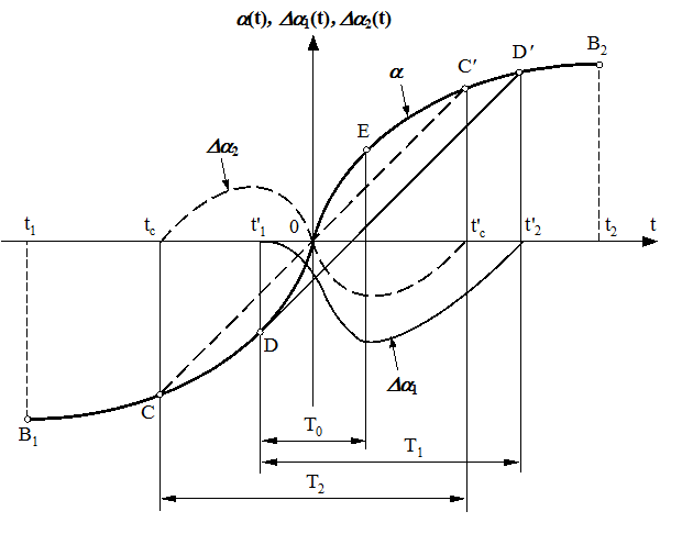 Рассмотрим этот эффект на примере азимутальной плоскости. На рисунке 3 показано изменение азимута ИСЗ a (кривая B 1 B 2 ) и рассогласований Da 1 и Da 2 от времени для двух стратегий прохождения антенной особых точек (области зенита). Начало координат соответствует b = P. Момент времени t 1 соответствует выходу ИСЗ из-за горизонта, t 2 - заходу за горизонт (b = 0). Точки B 1 и B 2, а также моменты времени t 1 и t 2 соответствуют аналогичным на рис. 2.