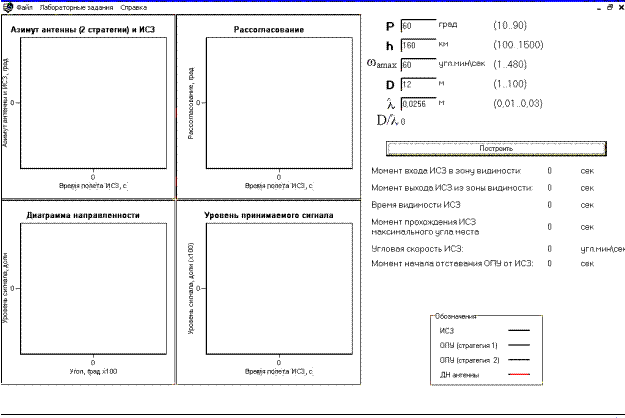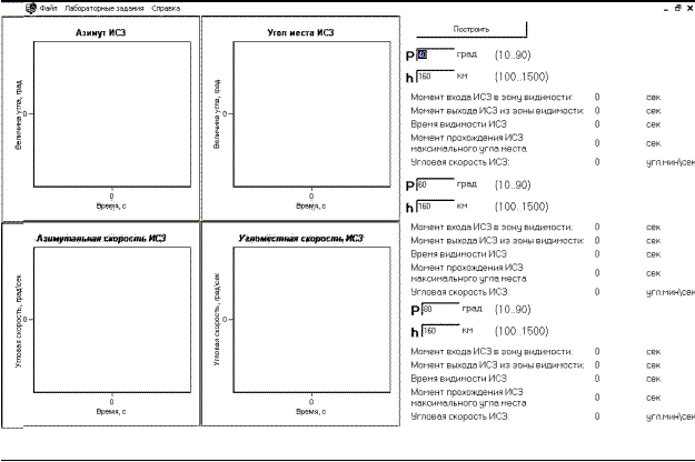 В первом задании исследуются характеристики движения ИСЗ. Рабочее окно задания 1 (рис. 4) содержит окна исходных данных, поля графиков и рассчитанных данных. Исходными данными являются высоты орбиты h и максимальный угол места (параметр) P.