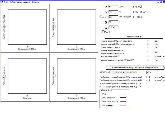 В третьем задании находится минимально – допустимое значение максимальной угловой скорости антенны w Аmax при заданном допустимом снижении уровня сигнала. Рабочее окно задания 3 (рис. 6) незначительно отличается от аналогичного для задания 2: добавлена кнопка “Расчет минимально - допустимой скорости ОПУ” и окно задания допустимого минимального уровня сигнала. В поле рассчитанных данных добавлены требуемые максимальная угловая скорость антенны w Аmax и допустимое снижение уровня сигнала для двух стратегий. При проверке достоверности полученных результатов по снижению уровня сигналов для двух стратегий значения w Аmax могут быть занесены двойным нажатием левой клавиши мышки на соответствующей строке w Аmax из поля рассчитанных данных.