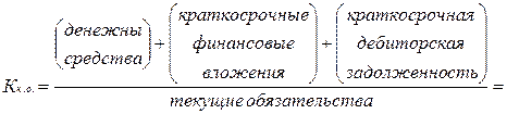3) Коэффициент «критической оценки» – показывает, какая часть краткосрочных обязательств организации может быть немедленно погашена за счёт денежных средств, средств в краткосрочных ценных бумагах, а также поступлений по расчётам. Однако следует иметь в виду, что достоверность выводов по результатам этого коэффициента и его динамики в значительной степени зависит в значительной степени от качества дебиторской задолженности (сроков образования, финансового положения должника и др.), что можно выявить только по данным внутреннего учёта. Нормальное ограничение: допустимое 0,7-0,8; желательно Кк.о.≈1.