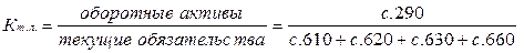 4) Коэффициент текущей ликвидности – показывает, какую часть текущих обязательств по кредитам и расчётам можно погасить, мобилизовав средства, т.е. сколько денежных единиц текущих оборотных активов приходится на одну единицу текущих обязательств. Нормальное ограничение: необходимое значение 1,5; оптимальное Кт.л.≈2,0-3,5. Коэффициент равный 3,0 и более, означает высокую степень ликвидности и благоприятные условия для кредиторов и инвесторов. Кроме того, это означает, что предприятие имеет больше средств, чем может эффективно использовать, что влечёт за собой ухудшение эффективности использования всех активов [19,с.136].