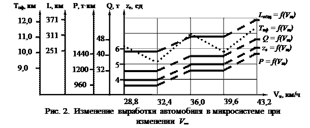 В качестве примера рассмотрим влияние изменения аргумента (среднетехнической скорости Vт), на функционирование микросистемы, расчёт выполнен по формулам (5) – (16), результаты представим в табличной форме (табл. 2) и на графиках (рис. 2).