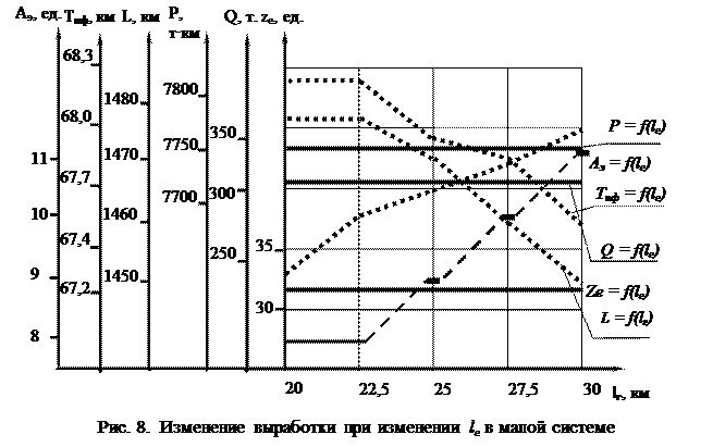 Для примера рассмотрим влияние изменения расстояния перевозки грузов Lг, результаты представим в табл. 9, которая наглядно показывает производительность каждого отдельного автомобиля и малой системы в целом.