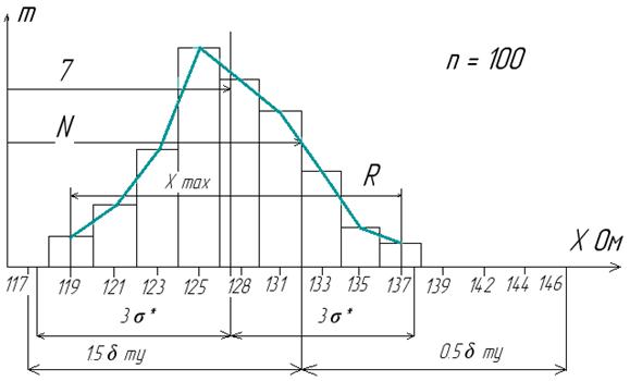 .На графике рисунка 2 отмечены: значение номинала, поля допуска относительно номинала, а также среднее значение X и границы поля рассеяния