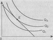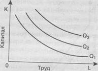 Из рис. 21.6 видно, что изокванта, расположенная ближе к началу координат, дает меньшее количество производимой продукции (изокванта Q1). Изокванты, расположенные выше и правее изокванты Q2, вызовут изменение большего объема факторов производства, нежели позволяет бюджетное ограничение производителя.