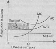 · цена ниже минимума средних переменных издержек, что означает прекращение производства, ибо потери фирмы превышают постоянные издержки (рис. 26.6).